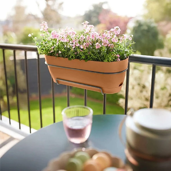 - This trendy trough planter has an integrated, high-quality metal rack and will fit on almost any balcony