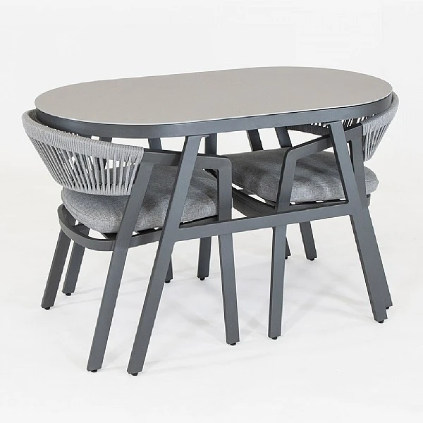 • Set comprises: 2 x dining chairs, 2 x cushion pads, 1 x compact oval table